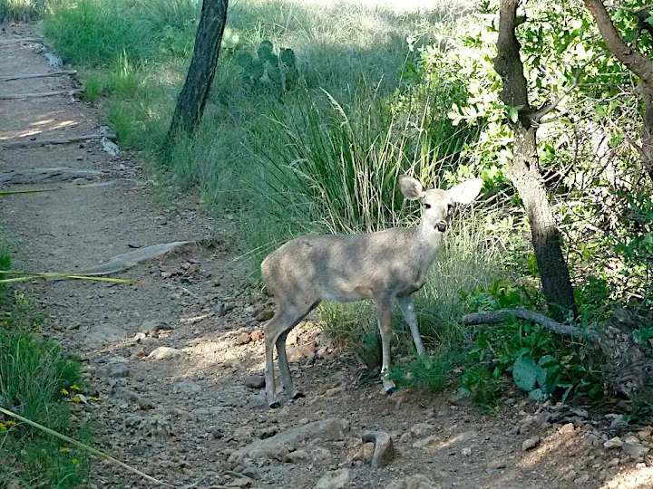 It does start feeling cooler as we gain altitude. My watch shows 30 degrees Celsius at the top and nearly 40 at the desert floor. And it's probably not even the hottest day here. To escape the heat we start early and shortly after entering the tree zone we see a deer right in the middle of the trail. He seems to be as interested in us as we are in him. Natalia takes what must be 50 pictures. Only when we decide to hike past him the deer retreats into the forest.