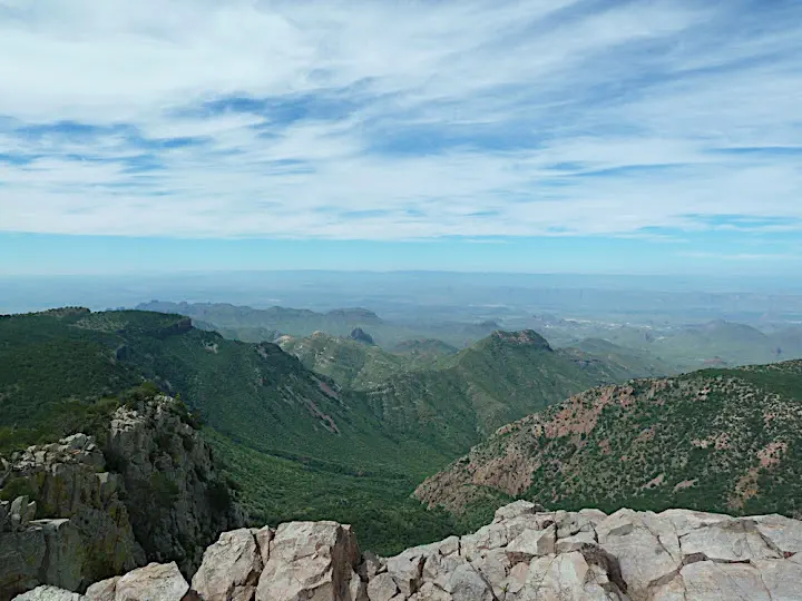 I reach the summit at the exact moment when the sunscreen mixed with my sweat decides to finally get into my eyes. Squinting and crying a bit I see our friends from Maine there. The good news is that we found the right place. The bad news: there is no easier path down. But at least we are at the top. We savor the view trying not to think about what we'll have to do next. You can see really far away from here. On a good day even 100 miles. Deep into Mexico. Deep into Texas. Today is much worse. Park pamphlet blames pollution. We are as far away as one can get from civilization in Texas. And we just climbed over the industrial smog. Hard to believe.
