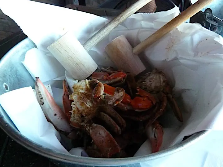 No one in the restaurant pays any attention to us, so either they too polite to gawk or we are doing it more or less correctly. Next time the waitress stops to ask if everything is OK I admit we are not sure if we know what we are doing. She takes one look at the throw-away bucket and apparently satisfied she utters what sounds to us like the most beautiful sentence in English: Y'all doing great. Just whack the hell out of them.
