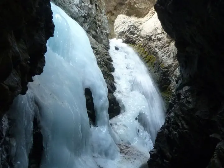 It's late afternoon when exhausted and very dirty we leave the park. Tires are re-inflated and we switch to our evening attire. Nothing fancy, just street shoes and clean T-shirts. And then Natalia, remembering she is not responsible for any of the daily misfortunes yet, suggests we check out nearby falls. I agree. It's just I don't think I need to change back into the hiking boots. Big mistake. The trail is easy if a tad steep. But when we get to the falls it turns out that some wading upstream is required to actually see the falls. Casual activity involving jumping from one slick stone to another sleek stone renders my shoes worse then useless. My pirouettes on the other hand are improving with each near miss of a landing. I want to give up but Natalia does not let me. And of course she is right, when we finally sneak into the cavernous rift the falls unwillingly present themselves: surely spectacular at any time of year, in May they look even more unusual since one half is still frozen.