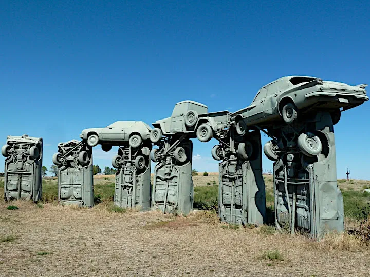 Extinct animals, discontinued cars and disarmed rockets meet their end at the Great Plains. Grass covers many a secret and is a great backdrop for modern art installations. You get extra points for confounding future archeologist: just to think that we may know as little about Stonehenge as they will deduce about Carhenge.