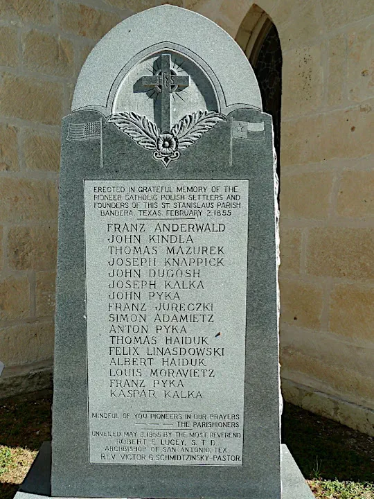 Among all those German settlements sits Bandera, pop. 957 calling itself the cowboy capital of the world. Cowboys probably don't know this but the town turns out to be established in 1855 by Polish families. We stop by the cemetery. Looking at gravestones I recognize Polish names: Pyka, Kalka (Kałka?), Adamietz (Adamiec?), Mazurek, Jureczki (Jureczko?), Dugosh (Długosz?). One can see in the spelling of last names and American first names the pressure to assimilate and leave one's roots behind. The commemorative stone next to the St. Stanislaus church lists settlers' names that look Polish, Czech, German. Not surprising since according to Bandera County Courier the immigrants came from Upper Silesia.