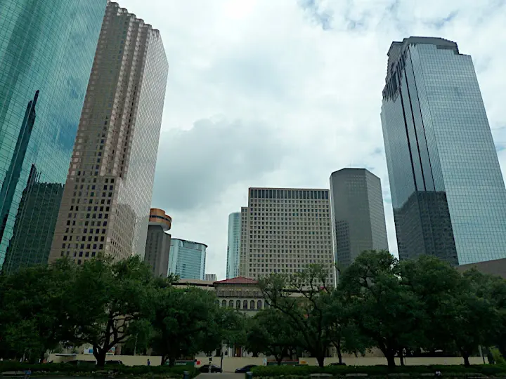 Houston is a maze of multi-lane superhighways crisscrossing a forest of office towers with pockets of isolated residential neighborhoods. This is a city built for cars with multitude of garages and parking lots to accommodate all the people driving to town: one driver per vehicle. Buildings are designed to look good from the highway as if that was their primary objective.