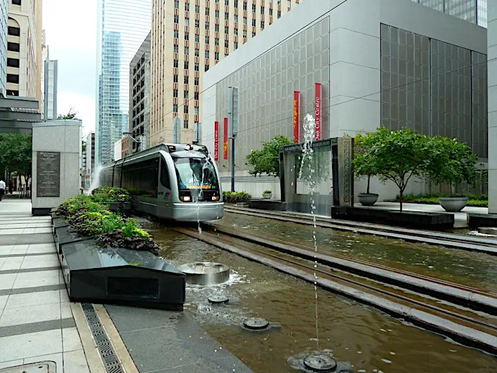 We take a brief tour underground among the crowd of office workers on their lunch hour: men in suits, women in pant-suits and high heels. Everybody with a determined look of a person on the mission: get lunch, finish work, hop in the car and leave the concrete prison behind. We ascend on the surface that is full of towering buildings in all possible styles from Italianate to all-glass. There is even a fast street train. Interesting marriage of utility, esthetics and space saving takes its tracks through a fountain that takes one block along the Main Street. For such a grand place Houston Downtown it's surprisingly devoid of people and cars this time of the day. It all changes in a few hours when we try to leave the city: suddenly cars are clogging six lane highways, zoom on three-level fly-over ramps going in all possible directions, honk and cut across lanes rarely bothering to signal.
