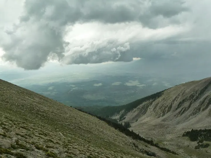 But now we are with this kid on the verge of tears, scared of the thunderstorm (slowly but surely getting closer) and worrying about his mom on top of the mountain. We learn that his mom told him to wait for her. We are on 13000 feet - the partial oxygen pressure here is around 65% of that on the sea level. Which may not affect judgement but certainly causes one feel tired beyond actual physical exertion. Loose rocks make footing tricky. You can hurt yourself here in 10 different ways without trying hard. I would think twice about hiking this trail alone without at least letting somebody know my exact whereabouts. Then again: I am not a parent.