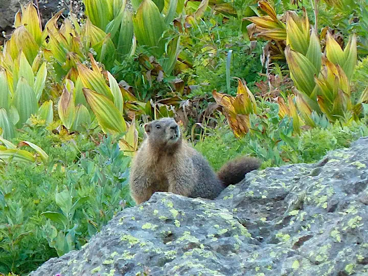 It's not like the view is not pretty. Alpine valley, green meadows, waterfalls, pinkish peaks on the horizon. Finally we see someone coming down. I try to compose myself to be able to utter perfunctory hellos and howareyous. The guy cannot be older than 20 and - of course - not looking tired at all, stops by and smiles encouragingly as we hike passed him. He wants to know how much longer we intend to go up. I look at my watch and it seems we have to turn back soon as the sun is getting close to setting. I tell him that. His body language changes. We should not give up now he says. We absolutely have to go to the lake. That's what I was worried about. Kind strangers. They mean well. He proceeds to describe the lake, how blue it is, how serene and perfect the valley looks from up there. So now I know, we'll have to hike up. I resist the urge to push the kid over the edge of the trail. He looks compact but might be stronger than he appears and I am not known to get into a fight with people like that. So I thank him profusely. Yes. We will check it out. Even if we later get eaten by bears and marmots. Do marmots eat hikers? I know bears do. They must. How else can they grow that big?