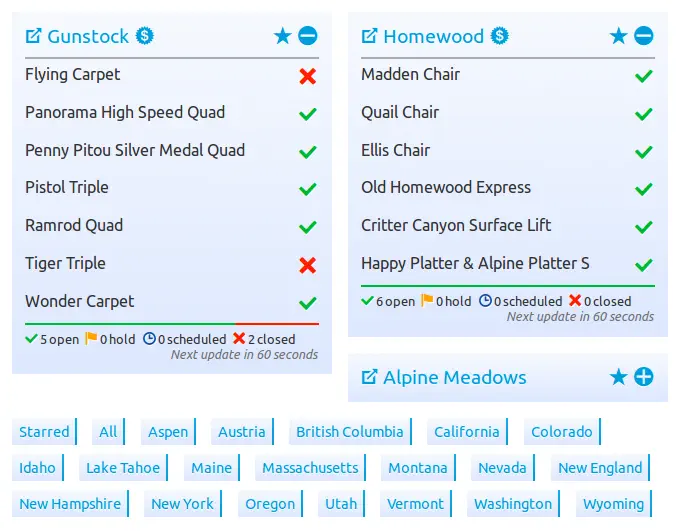 To show that we can do better, and not just whine and complain, I give you Liftie - a clean, simple, easy to read, fast, refresh-free ski resort lift status website. It shows lift status and not much else. It works on your computer and on your phone. You can view all the resorts that it supports, or just a single one. And if you frequent 2 or 3 in your area you can star them and create your own page, which you can bookmark.