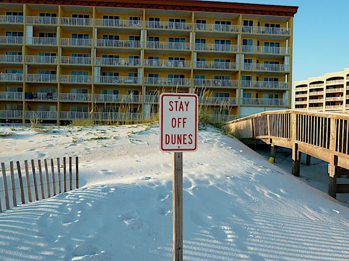 We see a different type of damage: trampled, receding dunes. Preservation attempts are marked by signs: dune restoration project and stay off dunes posted on the backdrop of multi-story beach resorts. Real restoration effort would start off by destroying those vacation high-rises. But there is hope. Great quantities the oil may wash on those beaches, the resorts will empty and crumble and dunes will reclaim the sand.