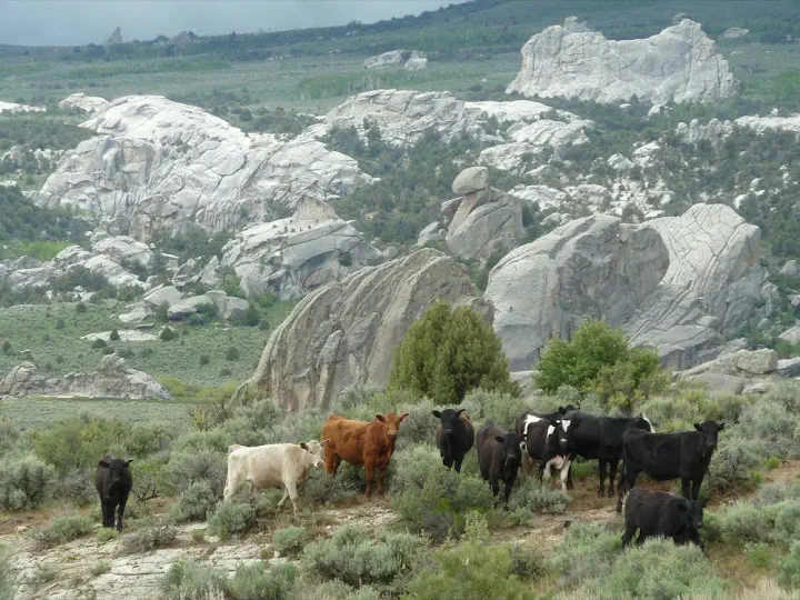 Appearances quickly prove to be deceiving. Another Idaho slogan is Vacation Wonderland. Which is not surprising if you consider that Idaho has the most forest and the largest continuous wilderness among the lower 49. Not really ready for No Return Wilderness we start exploring City of Rocks and quickly realize that agriculture and tourism are intertwined here. Hiking, climbing and grazing (sic!) are listed under activities at the park entrance, but we try to ignore the third option. Ignore at our peril as it turns out when the trail takes us through a muddy stream. Fording is one thing, doing it under watchful eye of 20 or so cows apparently hiking in the opposite direction takes it to a completely different level of outdoor adventure. The cows seem to be way too interested in our modest struggle. Also not that impressed at our hand waving and noise making tactics. Looks like livestock handling requires different approach then what works on bears and mountain lions. We opt for a strategic withdrawal and some bushwhacking. Alternative trail requires climbing over barbed wire fencing but allows for stream crossing in a well deserved solitude. Wet and proud we quickly find ourselves in the middle of another pack of hiking cows. By the end of the day Damian is quite convinced that climbing is actually a safer option. None of the cows we saw was wearing a harness or carrying any ropes.