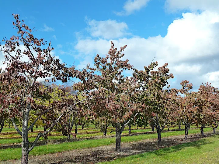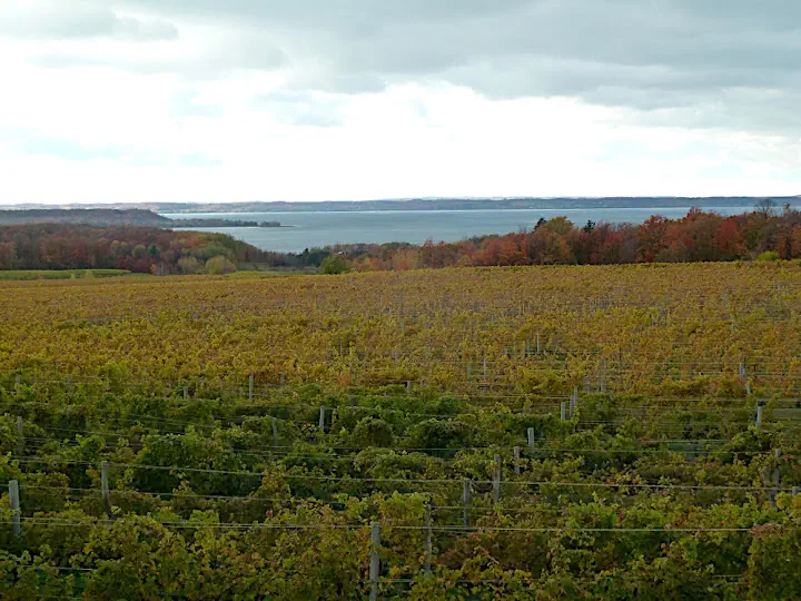 In addition to temper the climate the lakes serve as a tourist destination with requisite boutiques and golf courses. I find shopping on vacation, or golfing for that matter, to be a form of cruel and unusual punishment, but I do appreciate restaurants and coffee shops that follow tourists. We catch tail end of the leaf season: pretty but chilly and, most importantly, empty. Vacation homes abound but low temps keeps seniors at bay. There is little danger of Michigan becoming the second Florida with its beach skyscrapers. Hopefully locals will continue to make enough money on fruit to resist the lure of trading farms for subdivisions. Recession may help to that end.