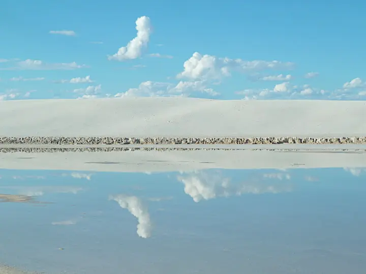 White Sands are located in a huge Tularosa Basin with no outflow. Water from the surrounding mountains brings minerals in and evaporates. Huge crystal structures that form on the bottom of drying intermittent lakes are broken down by wind and friction and carried over the valley. When the chips become small enough they start forming dunes which make their way through the desert at a rate of 30ft (10m) a year creating ever changing landscape. The grains are getting finer and finally they are permanently airborne and leave the basin as silt and dust.