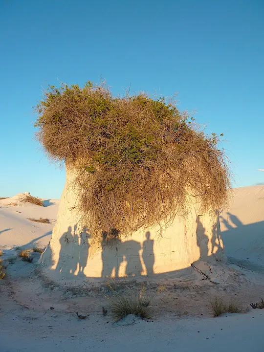 Quite a few plants and animals survive in the dunes. Sometimes they are close cousins of their desert kin: whiter, bigger, better at conserving water. Plants adapted by quickly outgrowing the encroaching dunes. When the dune passes the gypsum held by their roots forms pedestals used by other plants and by animals.