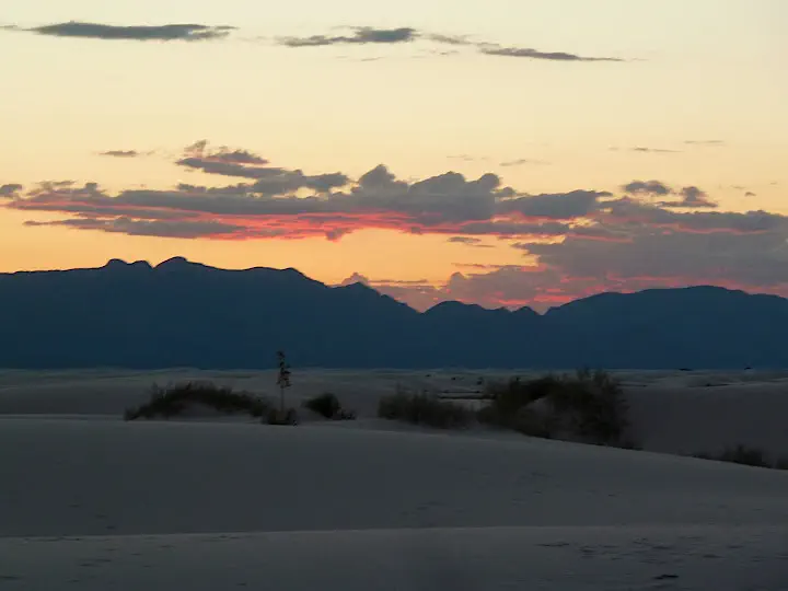 Sun sets in an express subtropical manner. When it gets darker White Sands are not white anymore. The Sacramento mountains shed the shades of pink and violet and finally disappear into black skies. I look up and see more stars than I ever thought possible. In face of such wonder the existence of people who choose to stay ignorant in the name of their narrow beliefs does not bother me anymore. anymore.