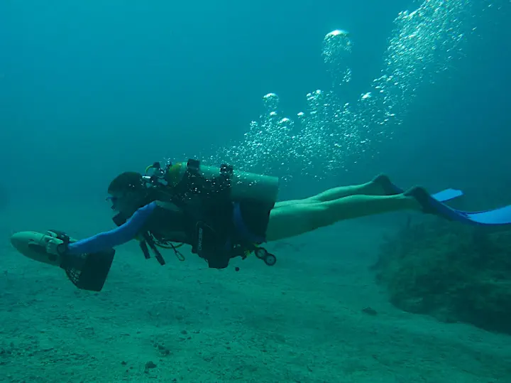 If wrecks and reefs and fish don't make your diving exciting enough there are always gadgets: knife, torch, safety sausage (really) and the biggest toy of all: underwater scooter. Which of course is not a scooter but a diver propulsion vehicle or, in PADI speak, DPV. By the way, diving argot is full of acronyms. Starting from SCUBA of course, which stands for Self Contained Underwater Breathing Apparatus, through BCD, BWRAF, CESA, DAN, DIR, PADI and VENTID. Pretty much each and every word is an acronym for something else. No wonder computer geeks were left with GNU.