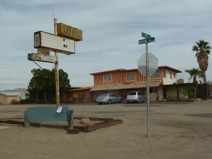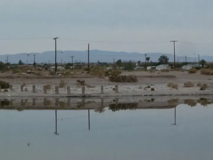 The cities did not go anyway. A planned resort community of Salton City, established in 1958, is still there. Area-wise, it's probably the biggest ghost city in the country. Numerous streets were planned, parcels were divided but very few structures were actually build. If you look at google maps you'd be excused to think you are visiting a desert metropolis. The fact that it sports a single motel that wasn't even open for several years is a dead giveaway that something is amiss here. Turns out that in reality Salton City is just empty space regularly punctuated by electric poles.