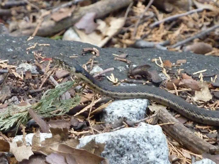 Making noise and stomping our feet did not seem to affect it. Finally the snake looked at us with what must have been a pure disgust and moved slowly across the trail disappearing into the bushes. I threw a stick in its general direction hoping to scare it away farther. I doubt very much it had any effect, but we were not inclined to check too thoroughly.