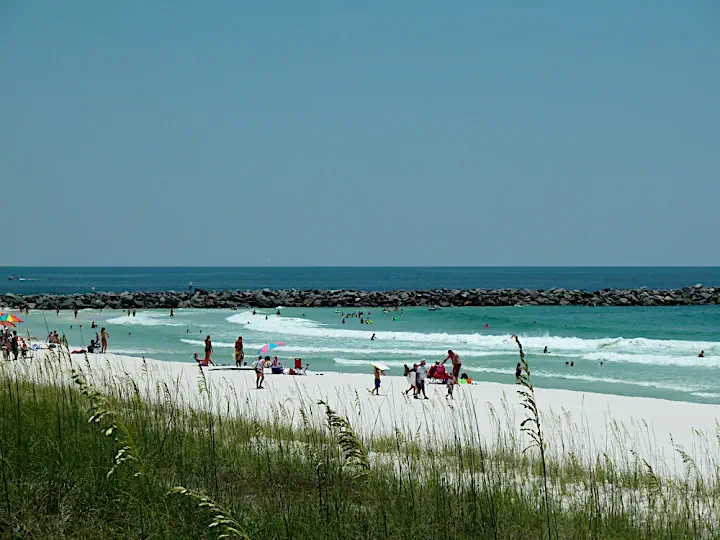 So armed with all that experience and healthy dose of preconceptions we are choosing a place to leave our towels on the beach carefully triangulating the distance from all the neighbors. Not that difficult of a task. It's not like beaches are crowded here, not during the week anyway. We take our masks and fins and go snorkeling along the St. Andrews jetty in Panama City Beach. We cannot actually see much underwater but it just feels good to be submerged. From time to time we check on our abandoned towels and clothes. And at some point we can no longer see them. Large family decides to camp on top of our place.