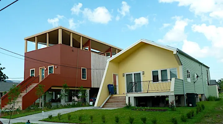 This is where the story takes an unexpected twist. Turns out that in 2007 Brad Pitt (yes, this Brad Pitt) toured the neighborhood, got upset about government and city inaction and decided to do something. He talked a group of architects into designing and then donating designs of sustainable, green homes well suited for the area. The Make It Right foundation is in charge of marketing them to former residents. If you lived in the area before, you can select the design and buy such a house. The foundation helps financially but also offers courses in home ownership. The Atlantic article describes it in more details.